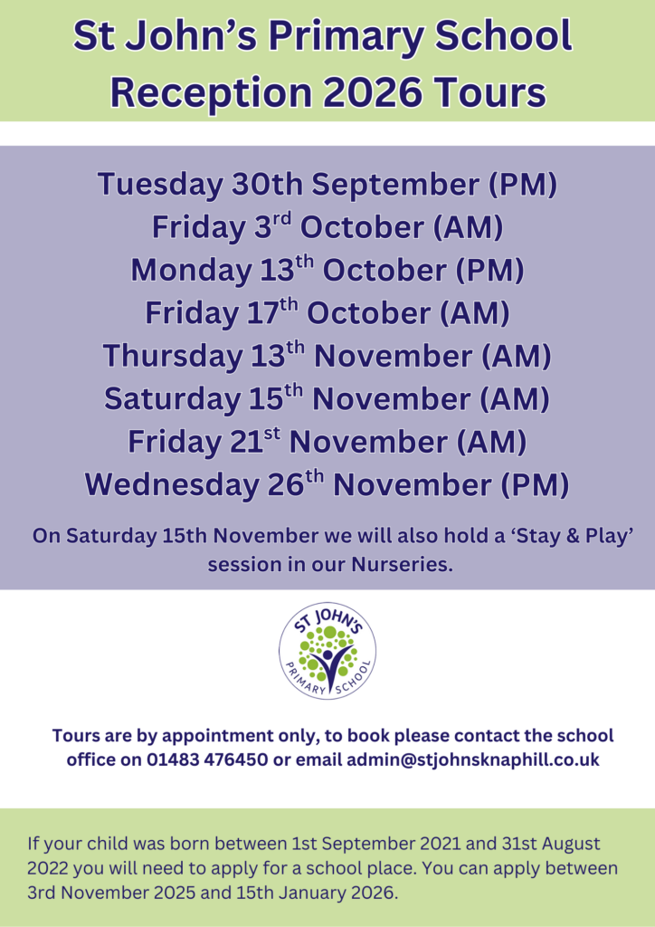 For specific enquiries about St John’s admissions, please send an email to admin@stjohnsknaphill.co.uk.